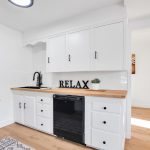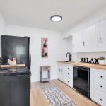 • An updated kitchen featuring brand-new butcher block countertops, a black stainless steel sink, and sleek black hardware, complemented by black appliances for a contemporary flair.