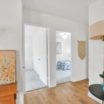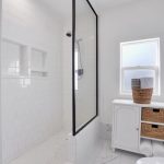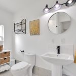 • A renovated bathroom with tile floors, new lighting, and updated trim and base moldings that create a cohesive, modern look.